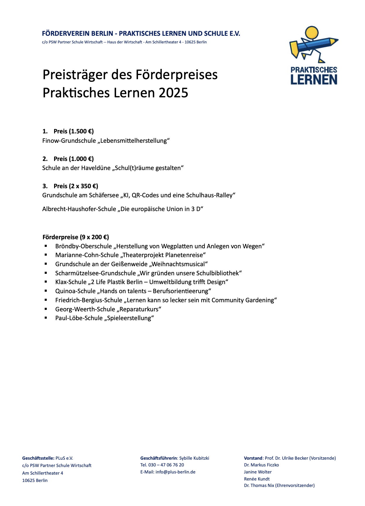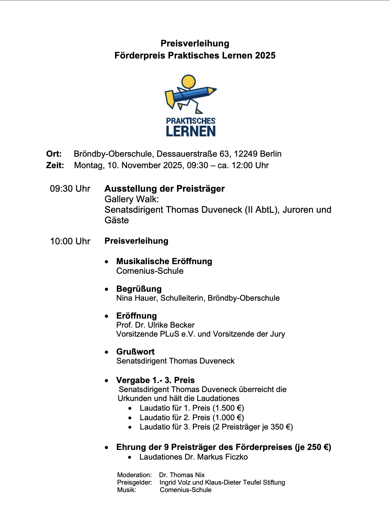 Der Förderpreis wird ausgeschrieben durch den Förderverein Berlin – Praktisches Lernen und Schule e.V. (PLuS e.V.) in Zusammenarbeit mit der Senatsverwaltung für Bildung, Jugend und Familie sowie der Volz-Teufel-Stiftung.