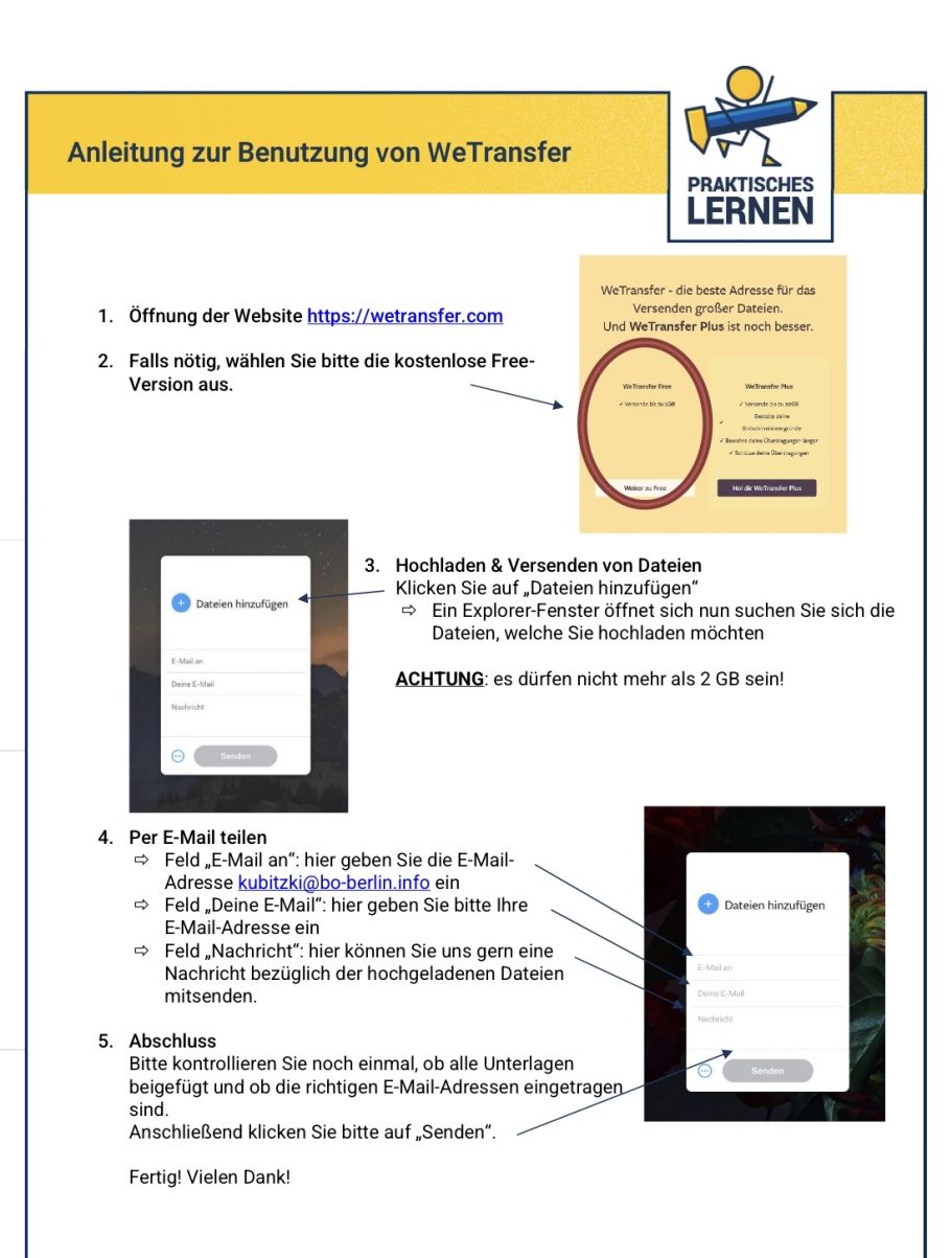 Mit We Transfer können Sie Ihre Unterlagen an PLuS e.V. senden. Bei Rückfragen wenden Sie sich gerne an Frau Kubitzki: 030 - 47 06 76 20
